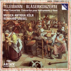 8. Aproveito para recomendar o CD “Telemann: Bläserkonzerte” com o excelente Musica Antiqua Köln dirigido por Reinhard Goebel (DG/Archiv). Os instrumentistas são verdadeiros atletas olímpicos! Que música difícil!!! A beleza da escrita tem identidade própria! Para se ter uma idéia, o concerto para flauta doce, flauta transversa, cordas e contínuo em Mi menor desse álbum traz um Presto quase inexeqüível (dificuldade violenta!) em estilo turco/oriental… Algo que deve ter abalado a platéia na época! Aqui está a sua capa: